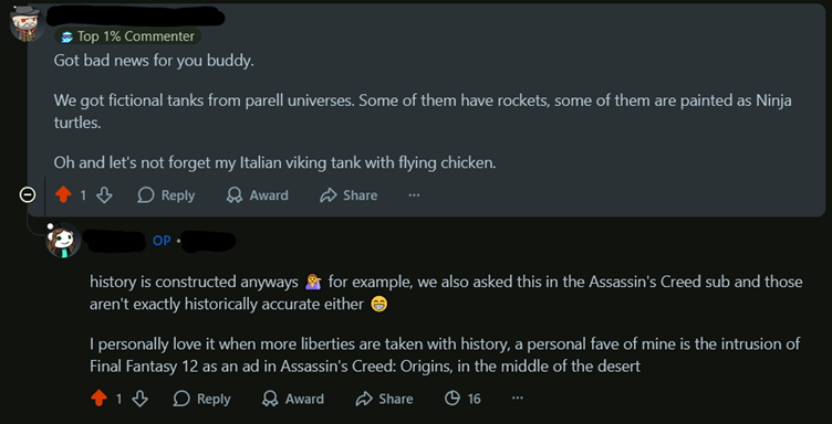 I would describe these comments as showing genuine interest while still approaching me as an “outsider.” This seems to be the moment where my previous experience as a Redditor comes in, because these comments require fitting reactions themselves: we don’t want prospective participants to be put off by reductively negative comments and would like to encourage the more constructive engagement. I try to be helpful when possible in my own reactions, and mirror the mode the reactions take. If the comment is snarky, my first line snaps back (while continuing in a lighter tone and acknowledging a possible concern they had):