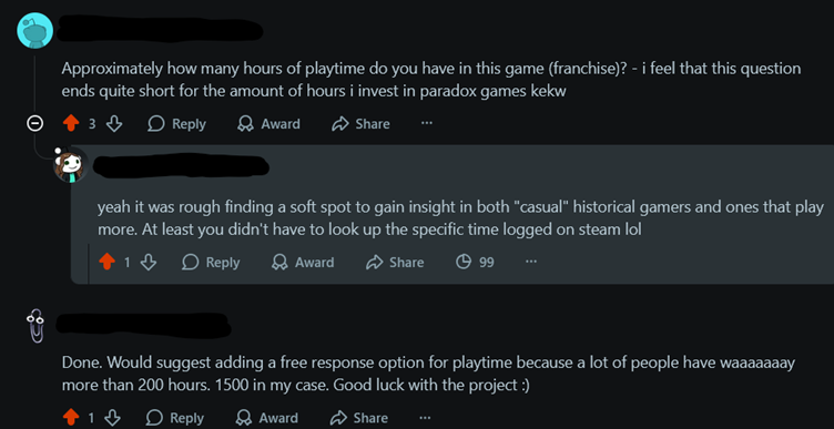 If it’s pointing to a weakness in a question, for example the lack of possibility to distinguish between having played a game for 200 or 1500 hours, I explain why we made that choice (if I believe it won’t compromise the answers) and thank them for the feedback: